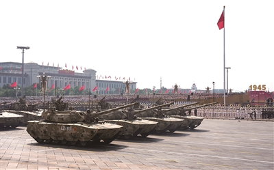 ■地面突击方队的22辆战车呈“箭”形排列。作为陆军地面突击力量的新一代装甲装备,受阅的99B坦克、100坦克、100支援战车,尽显机动夺要、攻坚突破的强大战力,是我军高技术装备体系的重要组成部分。100坦克以及100支援战车,能够遂行远程快速部署、战役目标夺控、战术纵深突击、城市攻防作战、联合火力引导等作战任务。