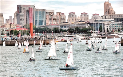 千帆竞逐的壮观场面,勾勒出青岛最美风景线。图为2025青岛国际OP帆船营暨帆船赛与2025青岛-东盟OP帆船邀请赛开赛,数百名中外青少年小水手驾驭着OP帆船,展现了帆船运动的青春与希望。
