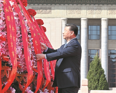 习近平迈步上前,仔细整理花篮缎带。随后,习近平等党和国家领导人缓步绕行,瞻仰人民英雄纪念碑。