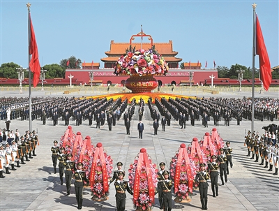 方阵前,以中共中央,全国人大常委会,国务院,全国政协,中央军委,各民主党派、全国工商联和无党派爱国人士,各人民团体和各界群众,老战士、老同志和烈士亲属,中国少年先锋队名义敬献的9个大型花篮一字排开,花篮红色缎带上书写的“人民英雄永垂不朽”格外醒目。