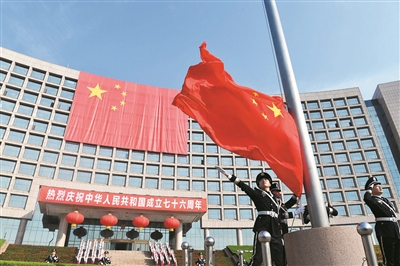本报10月1日讯 华夏大地,江山如画;红旗猎猎,举国同庆。1日上午,青岛市庆祝中华人民共和国成立76周年升国旗仪式在市级机关办公楼广场隆重举行。1200名社会各界代表、市民群众参加仪式,共同祝愿伟大祖国繁荣昌盛、人民幸福安康。