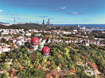 ■信号山的红色蘑菇楼,静立于五彩林海之中。王 雷 摄