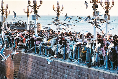 12月14日下午,在青岛栈桥景区,成片的海鸥翩然起舞,与来此观鸥互动的市民游客构成了一幅灵动的海滨冬韵图。