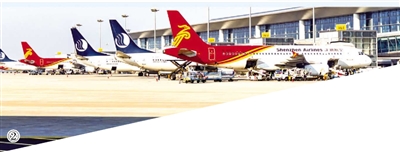 图②:青岛胶东国际机场停机坪上,几架飞机整装待发。