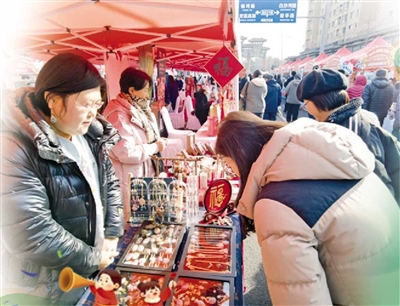 不远处,福田庄园花样大馒头展位前围满了顾客,总经理袁宪强忙着给顾客介绍自家的花样大馒头:“我们创新了传统面食制作工艺,你看这个‘新年快乐’馒头,上面特别设计了‘马’的造型,寓意‘马到成功’,特别受欢迎,线上线下卖到了全国各地。”