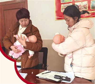 十来名学员围站在实训台前,屏息凝神、目不转睛。讲台上,老师手持婴儿模型演示抚触手法:“手掌要先搓热,力度要轻柔,顺着宝宝的脊柱慢慢往下,动作要连贯,还要留意宝宝的反应……”41岁的张东英站在前排,眼睛紧紧追随着老师的手,一边认真聆听,一边轻轻抚着怀里的婴儿模具。