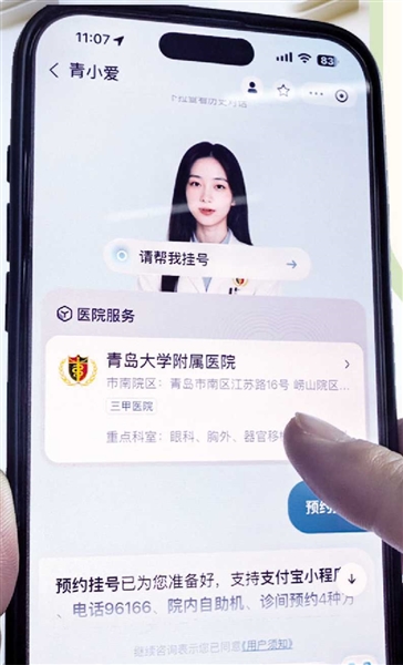 近日,45岁的市民陈先生感到右侧太阳穴有搏动性头痛,还伴有头晕。他打开支付宝,通过搜索找到“青岛大学附属医院青小爱”软件,向它描述病情,几秒钟后,AI助手给出回应:“根据您的症状描述,优先推荐神经内科就诊。青大附院崂山院区神经内科有3位擅长头痛与眩晕鉴别诊断的专家明天上午有号源,是否为您预约?”陈先生按照指引挂号成功,从打开手机到完成预约,仅用时2分48秒。而这只是他就医新体验的开始。