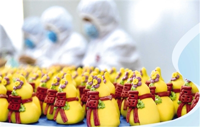 生产线的革新也推动了产品理念的迭代。用甜菜根粉、菠菜粉、南瓜粉等天然果蔬粉替代人工色素;自主研发低糖健康的赤小豆馅料;将产品从婚庆、百岁等传统场景拓展到母亲节花篮、年货礼盒、国潮醒狮等新领域。去年母亲节,一款面制花篮在抖音单日销售额即突破26万元。