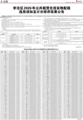 李沧区2026年公共租赁住房实物配租选房须知及计分排序结果公告
