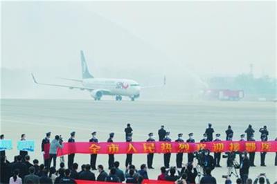 山航飞机载着援鄂医疗队降落青岛机场,飞机穿越“过水门”