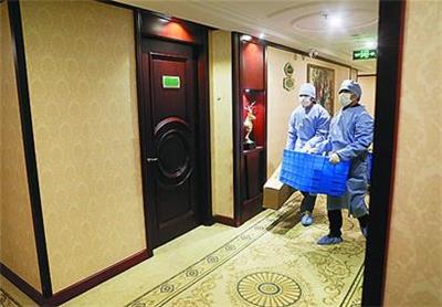 3月30日,在上海市松江区的集中隔离观察点,工作人员在分发快递。目前该隔离点的111间房间已完成全面消杀并实现100%入住隔离人员。 新华社发