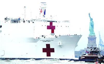 在美国纽约,美国海军医院船“舒适”号驶过自由女神像
