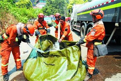 4月1日,在西昌市邛海泸山景区卧云山庄旁,消防队员在储水。西昌森林火灾目前主要有三条火线,前方2800余名扑火队员正分三线全力扑灭火灾。截至4月1日9时,西昌市已疏散群众24467人。新华社发