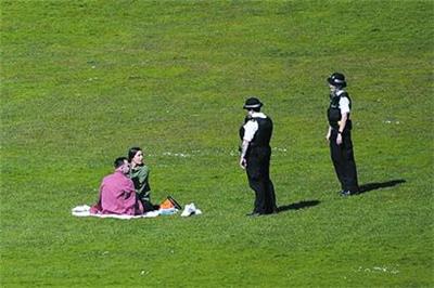 5日,在英国伦敦的格林尼治公园,警察劝离户外聚集者。英国政府要求民众停止一切不必要的外出。 新华社发