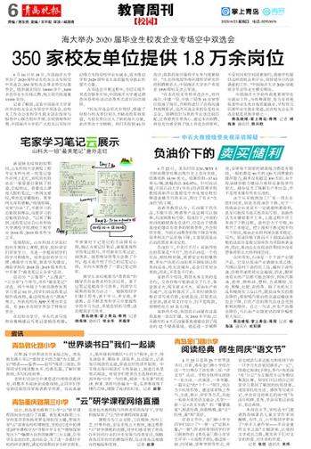 记者了解到,这是中国海洋大学首次举办校友企业专场空中双选会,由校友工作办公室和学生就业创业指导与服务中心联合组织开展。在疫情特殊时期,中国海洋大学的广大校友以实际行动鼎力支持母校毕业生就业,成为推动学校2020届毕业生高质量充分就业的强大力量。