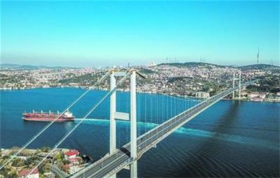 这是4月25日在土耳其伊斯坦布尔航拍的 “居家令”实施期间的空旷的博斯普鲁斯大桥。