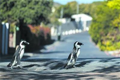 4月25日,在南非西蒙斯敦镇,两只非洲企鹅穿过“封城”期间空空的街道。新华社发