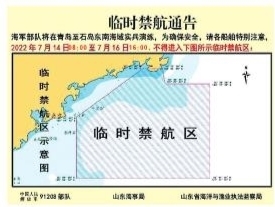 海军部队将在青岛至石岛东南海域实兵演练,为确保安全,请各船舶特别注意,2022年7月14日08:00至7月16日16:00,不得进入以下7点连线围成的临时禁航区: