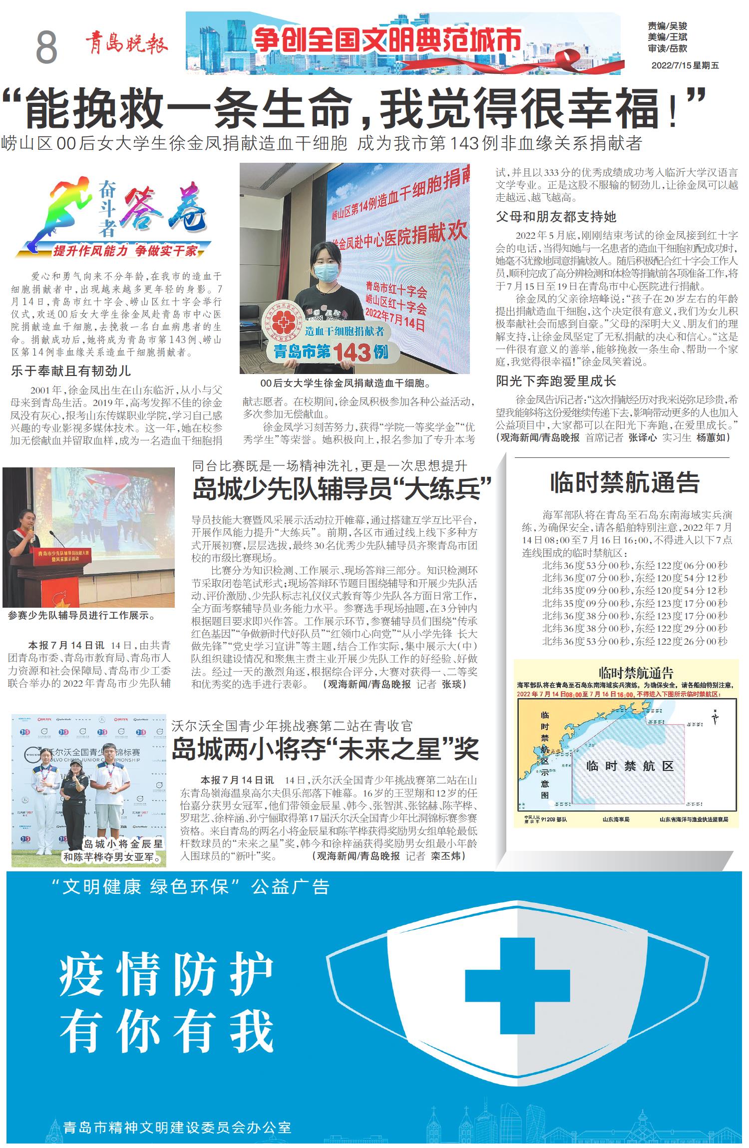 A01 头版 A02 奋进新征程 建功新时代 A03 走在前 开新局 A04 民生新闻 A05 奋进新征程 建功新时代 A06 争创全国文明典范城市 A07 活力海洋之都 精彩宜人之城 A08 争创全国文明典范城市 A09 警戒线 A10 健康波报 A11 健康波报 A12 博览