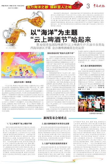 青岛啤酒节,醉美西海岸。青岛西海岸新区召开新闻发布会,第32届青岛国际啤酒节(云上啤酒节)将于7月22日至7月31日在线上举行,为期10天,让全球观众足不出户,“零距离”感受青岛特色啤酒文化,持续擦靓青岛西海岸新区“啤酒之城”国际名片,充分展现青岛“活力海洋之都、精彩宜人之城”的风采魅力。本届啤酒节以“海洋”为主题,精心组织策划明星嘉宾、网红达人演播厅直播互动,国际国内酒吧连线,世界各地演艺团体视频连线,探店VCR,线上主题之夜等系列“云上啤酒节”直播和云上商贸板块活动。线下将不再安排相关的文化体育活动,啤酒大篷不开放运营,不举行灯光秀和焰火秀表演。