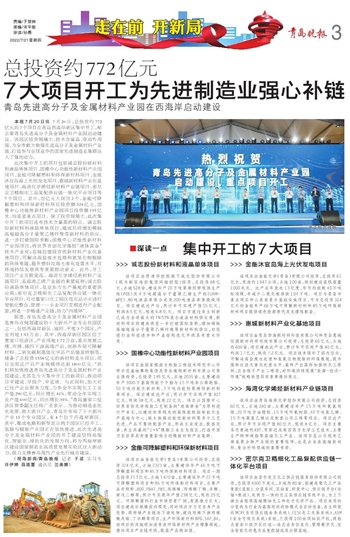本报7月20日讯 7月20日,总投资约772亿元的7个项目在青岛西海岸新区集中开工,标志着青岛先进高分子及金属材料产业园启动建设。该园区投资规模大、技术含量高、带动作用强,为全市做大做强先进高分子及金属材料产业链、打造参与全球竞争的国家先进制造业集群注入了强劲动力。