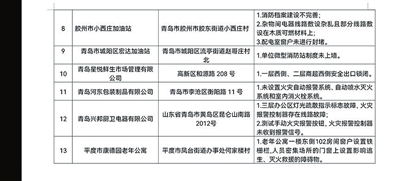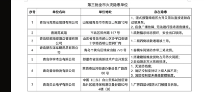 本报7月22日讯 近日,青岛市消防救援支队集中曝光今年第三批存在火灾隐患的企业单位,包括青岛马克商业管理有限公司在内的13家企业和单位被曝光。