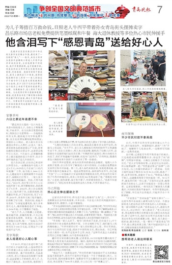 “最近来自五莲的一位六旬老人来青大附院看儿子,为给儿子筹集费用,开始卖字。在文化街买笔墨纸砚时,得到店主无偿帮助——为他提供所有文具,提供地方写字和免费午餐,店主还在朋友圈发起帮助倡议,得到好心人响应。老人街头卖字也遇到众多好心人帮忙,让老人一家人感受到青岛的浓浓爱心!”日前,在青岛晚报官微后台留言中,这条留言格外引人关注。7月22日,记者辗转联系上留言提到的老人牛西平,在古今斋听他讲述了近几年的经历。