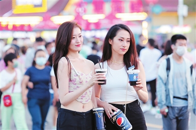 漫步在金沙滩啤酒城,最不缺的是发现美的眼睛。随手一拍,便是一张街拍大片。记者在金沙滩啤酒城两天走出超3万步,相机里除了“食全酒美”外,还记录了不少美丽的身影。夏日氛围感拉满的啤酒城是浑然天成的背景板,美女们纷纷拿出手机自拍,留下与金沙滩啤酒城的合影照。以啤酒为媒,啤酒城的底色是包容的,敞开怀抱欢迎所有人在此狂欢。与此同时,啤酒城的底色又是鲜亮的蓝色,总是澎湃着激情和动感。舞台上,劲歌热舞的演出者带动着全场的狂欢氛围;舞台下,姐妹淘全情投入,戴着口罩都能感受到她们的开心与洒脱。