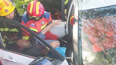 消防救援人员将伤者从车内救出。