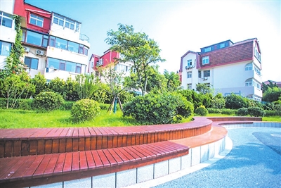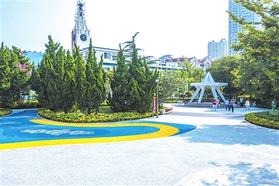 而观音峡路与西陵峡路交汇处的普通游园,也依托此次提升改造工程,结合周边居民的实际需求,被打造成了新的口袋公园——海乐园。海乐园中心为景观亭,在遮风避雨的同时,可供市民游客休憩;地面铺装是以透水胶粘石为主的新材料,颜色自然且脚感细腻;局部还设置了柔性塑胶为主的儿童活动场地和包含各类健身器械的健身场地。同时,场地周边还增加了笑脸条石座椅,呼应公园的“海乐”主题,完全竣工后将满足周边老年、儿童、中青年休闲、观海、健身、玩耍的多方面需求。