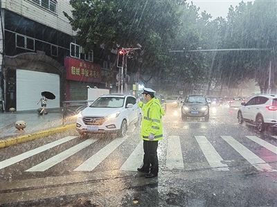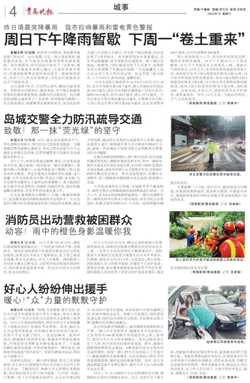 本报8月12日讯 12日,青岛迎来强降雨天气,多处道路出现积水,给市民出行带来安全隐患。为确保降雨期间道路交通安全,青岛交警启动恶劣天气交通安全管理应急预案,民警和辅警坚守在辖区各条道路及易积水点。