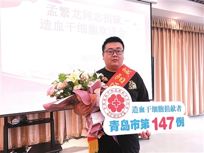 本报8月12日讯 12日上午,青岛市红十字会、城阳区红十字会和夏庄街道办事处为青岛言鼎忠建筑有限公司职工孟繁龙举行欢送会,为他赴青岛市中心医院捐献造血干细胞加油助力。他是城阳区今年第6例非血缘造血干细胞捐献志愿者,捐献成功后,他将成为城阳区第23例、青岛市第147例非血缘关系造血干细胞捐献者。