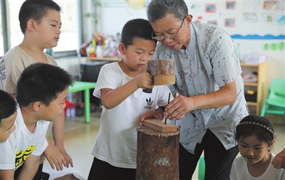 葛村榼子传承人王承厚在向孩子们传授制作技艺。