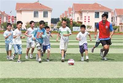 龙山街道前东葛村的操场上,大学生志愿者姜昊与孩子们一起踢球。