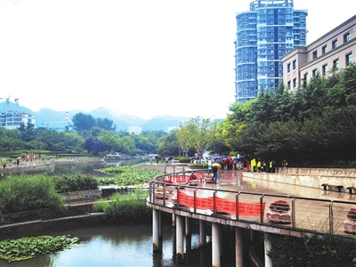 “有个男孩掉到古力井里去了,很多人在这里搜救。”8月25日中午12时许,多名市民向晚报反映,九水东路金水河公园附近发生了意外。记者到场后发现,九水东路北侧的金水河公园入口处已经被警戒线封锁,李沧区李村消防救援站、斑马救援队、星火救援队等多支救援力量正在警戒线以北约100米处的岸边搜救。