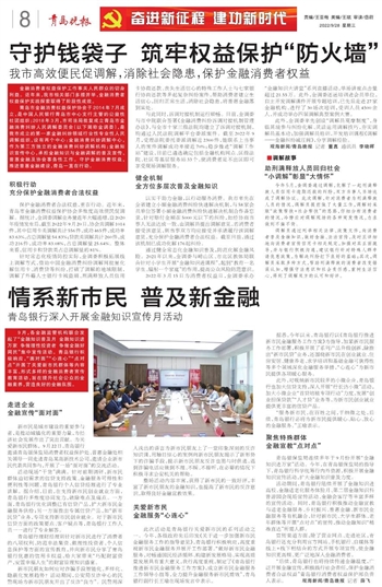 宣传渠道方面,除了营业网点、走进社区,青岛银行还充分利用官方网站、手机银行、自媒体等线上+线下相结合的方式开展专项宣传,使金融知识更高频、更广泛地深入金融消费者。