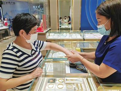 在利群金鼎广场中国黄金专柜,一对夫妇一大早就到商场来为刚出生不久的孙女选购宝宝锁,经过一番挑选,两人选定了一套一万元左右的饰品,包含了宝宝锁和宝宝手镯。利群金鼎广场中国黄金店长周芳告诉记者,自疫情以来,每逢“五一”“十一”假期,店里都要迎来销售高峰期,尤其以黄金饰品卖得最好,以前黄金饰品的消费群体主要是将要结婚的新人购买“三金”,但现在黄金饰品已经成为常规礼物,不光是结婚,也作为日常赠送亲人、朋友的礼物。