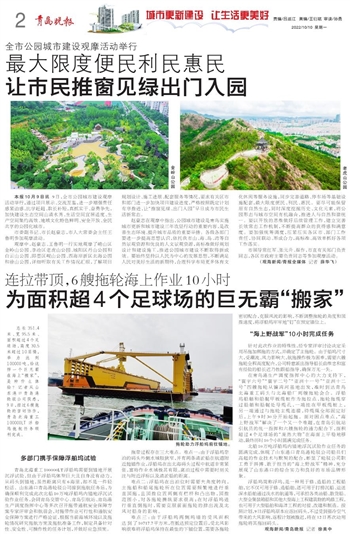 在青岛港生产调度指挥中心的大力支持下,“寰宇六号”“寰宇二号”“亚洲十一号”“亚洲十二号”四艘拖轮从镰湾河基地出发,准时到达青岛北海重工码头与北海船厂两艘拖轮会合。浮船坞船艏和船艉甲板缆桩作为拖拉点,拖轮拖缆穿过船艏和船艉处导缆孔,一端挂在甲板缆桩上,另一端通过与拖轮主缆连接,待缆绳全部固定好后,上午9时30分开始起拖。面对困点难点,“海上野战军”解决了一个又一个难题,在青岛引航站引航员的统一指挥和六艘拖轮的通力配合下,面积超过4个足球场的“庞然大物”在海面上平稳地移动,最终历时10个小时圆满完成任务。