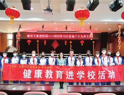 10月17日,由青岛市卫生健康委和青岛晚报联合主办的“健康教育进学校”公益活动走进青岛市第三十九中学,山东第一医科大学附属青岛眼科医院眼视光学与角膜接触镜科主治医师赵陈培担当嘉宾,面对面向师生讲解如何科学有效地防控近视。