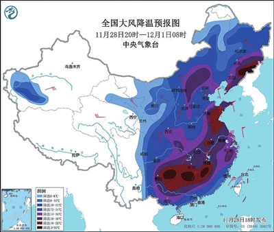 全国大风降温预报图(11月28日20时-12月1日08时)。