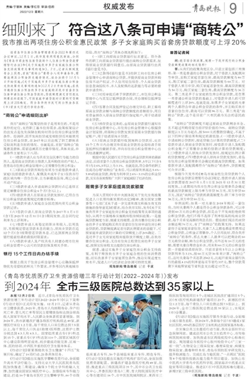 《行动计划》提出实施医学攀峰攻坚行动,全面提升高水平诊疗能力。支持北京大学人民医院青岛医院加快推进二期建设,确保3个院士学科的输入支撑,加快建设国家区域医疗中心。加强临床专科能力建设,打造10个青岛市医疗卫生攀峰学科、60个市级临床重点专科、50个县域临床重点专科、特色专科。《行动计划》还提出实施医疗机构扩容行动,全面加强优质资源配置。新建改扩建各级医疗机构49家,包括:推进重点三级医院项目21个,其中市公共卫生临床中心、齐鲁医院(青岛)二期、青大附院国际医疗中心等在建项目16个,市中医医院城阳院区、莱西市三级医院等规划项目5个;老城区医院改扩建项目5个;区(市)医疗机构新建改扩建项目23个。新增医疗床位1.2万张,每千常住人口床位数达到7.5张以上。到2024年,全市三级医院总数达到35家以上,实现区(市)全覆盖。