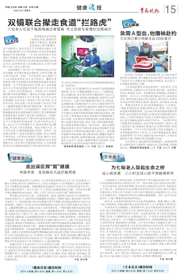 连续喝稀饭三周,朱大爷下咽困难的症状迟迟没有缓解,甚至喝水都会出现呛咳,还伴有反酸、烧心等不适症状。短短一个月的时间,老人就瘦了2斤,这让他寝食难安,家人也开始担心。辗转几家医院均诊断为食管癌并食管周围及纵隔多发淋巴结转移。为了寻求更好的治疗方案,朱大爷来到青岛市市立医院东院胸外科张哲主任门诊寻求帮助。入院后,经过胃镜的进一步检查,朱大爷被明确诊断为食管癌(鳞癌)。“患者84岁高龄,基础情况较差,放化疗风险较大且疗效不佳,开刀手术虽然效果明确,但是对老人身体是个很大的考验,经过综合评估,我们选取了患者受益最大的治疗方案——胸腹腔镜联合微创食管癌切除。”张哲表示。在张哲主任带领下,手术如期进行,方案为先行胸腔镜胸段食管的游离及淋巴结清扫,再行腹腔镜胃的游离及淋巴结清扫,最后进行颈部吻合。该团队在高龄食管癌微创治疗方面有着丰富的临床经验,对手术可能遇到的挑战做了全面评估和应对方案。经过4个小时的精准手术,患者的病灶被完整切除,并完成了消化道重建。得益于微创术式,朱大爷术后第3天顺利拔除胸腔引流管。在医护一体化精心管理下,患者住院期间无感染、吻合口瘘等严重并发症,术后第8天恢复经口饮食,最终于术后12天顺利康复出院。“腔镜联合的微创术式在食管癌根治术上的应用已经得到临床验证,它为食管癌患者尤其是高龄患者提供了更多选择和希望,近年来,我们已经通过该术式让多位高龄食管癌患者受益。”张哲表示。
