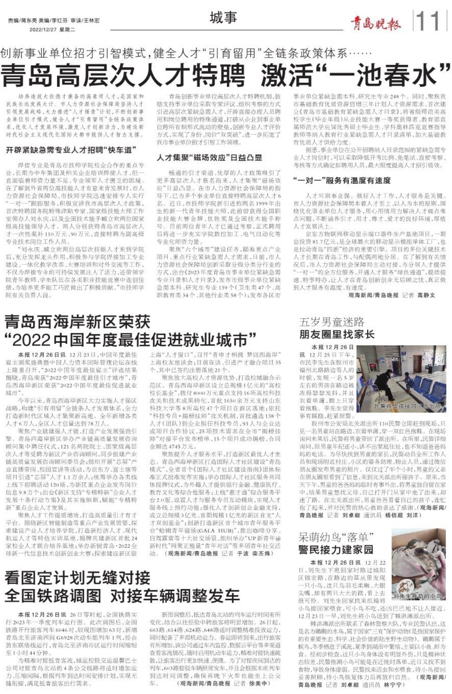 青岛西海岸新区荣获“2022中国年度最佳促进就业城市”