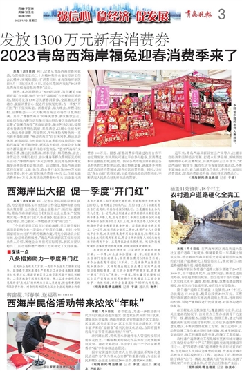 本报1月9日讯 9日,记者从青岛西海岸新区获悉,为全面贯彻落实中央经济工作会议精神和省市有关决策部署,全力推进工业企业稳生产、拓市场、提质效,青岛西海岸新区出台《支持工业企业稳生产促发展实现一季度开门红八条措施》,促进新区工业经济稳定增长,助力新区一季度经济实现“开门红”。