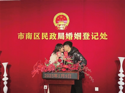 “最美”婚姻登记处迎来首对办理结婚登记的新人。张琰 摄
