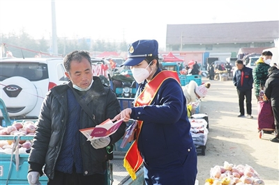 平度市消防救援大队宣传员在向赶集群众宣传消防安全知识。