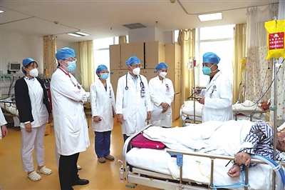 新冠疫情之下,呼吸科医护人员必须把自己训练成最强战队和最强的单兵。他们不断变换战斗队形,一切根据患者的医疗救治需要做调整。去年12月19日,呼吸与危重症医学一科与保健五(呼吸与危重症医学)科病区合并,派出呼吸专业骨干医生支援急诊,全力保障急诊运行。病区加快运转,抓紧从急诊收治急危重症患者。12月24日,为进一步保障急诊工作,呼吸与危重症医学二科与呼吸与危重症医学一科进行了再次合并,重症监护室及病房所有病人均转入呼吸与危重症医学一科。12月28日,保健五科(呼吸与危重症医学)开科,短短一上午时间收治病人50人,抢救转出至ICU3人,创造了收治病人的历史纪录。那一天,全科人都没有吃午饭。随着急诊和危重症病人的持续增加,院区20多个专业病房转换成综合收治病房。新冠病人收到哪里,呼吸科医生和护士的工作就延伸到哪里。