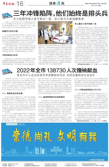 热血青岛,大爱之城。1月19日,记者从青岛市中心血站获悉,2022年市中心血站克服复杂严峻的疫情防控形势,多措并举保障临床用血,圆满完成了采供血任务。全市共有138730人次撸袖献血,其中121581人次捐献全血4426万毫升,17149人捐献单采血小板29673个治疗量。我市采供血量稳居全省首位,无偿献血各项工作迈上新台阶。