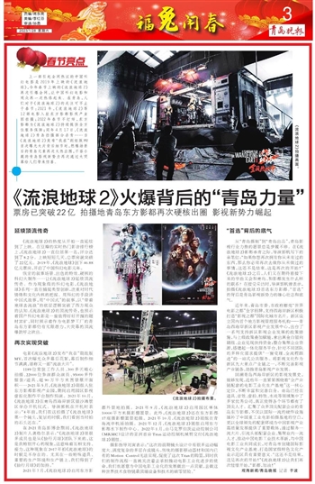 上一部引起全网热议的中国科幻电影是2019年上映的《流浪地球》,今年春节上映的《流浪地球2》再次引爆全网,让中国科幻电影和观众再一次热络起来。在青岛,人们对于《流浪地球2》的关注可不止于春节:2021年,《流浪地球2》等12部电影入驻东方影都影视产业园拍摄;2022年春节不打烊,东方影都为《流浪地球2》持续提供全方位服务保障;同年4月17日,《流浪地球2》青岛拍摄部分杀青……当《流浪地球2》发布“我在”剧组版MV首次曝光大片背后细节时,燃爆场景后的青岛元素再次火热出圈,不容小觑的青岛影视新势力再次通过大荧幕给人们带来惊喜。