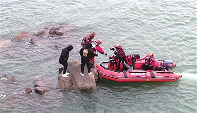 1月22日下午1时30分,青岛市公安局海岸警察支队薛家岛派出所接到指令,在东环岛路山东村公交站岸边附近的礁石上,有三名群众遇险。派出所民警和青岛市消防救援支队特勤大队三站的救援人员到场后,发现三人被困在礁石上,不断上涨的海水已没过他们的腰部,情况非常紧急。民警兵分两路,一边维持秩序并努力安抚受困群众的情绪,一边联系附近的快艇开展救援。经过共同努力,三名被困礁石的群众被安全救回。